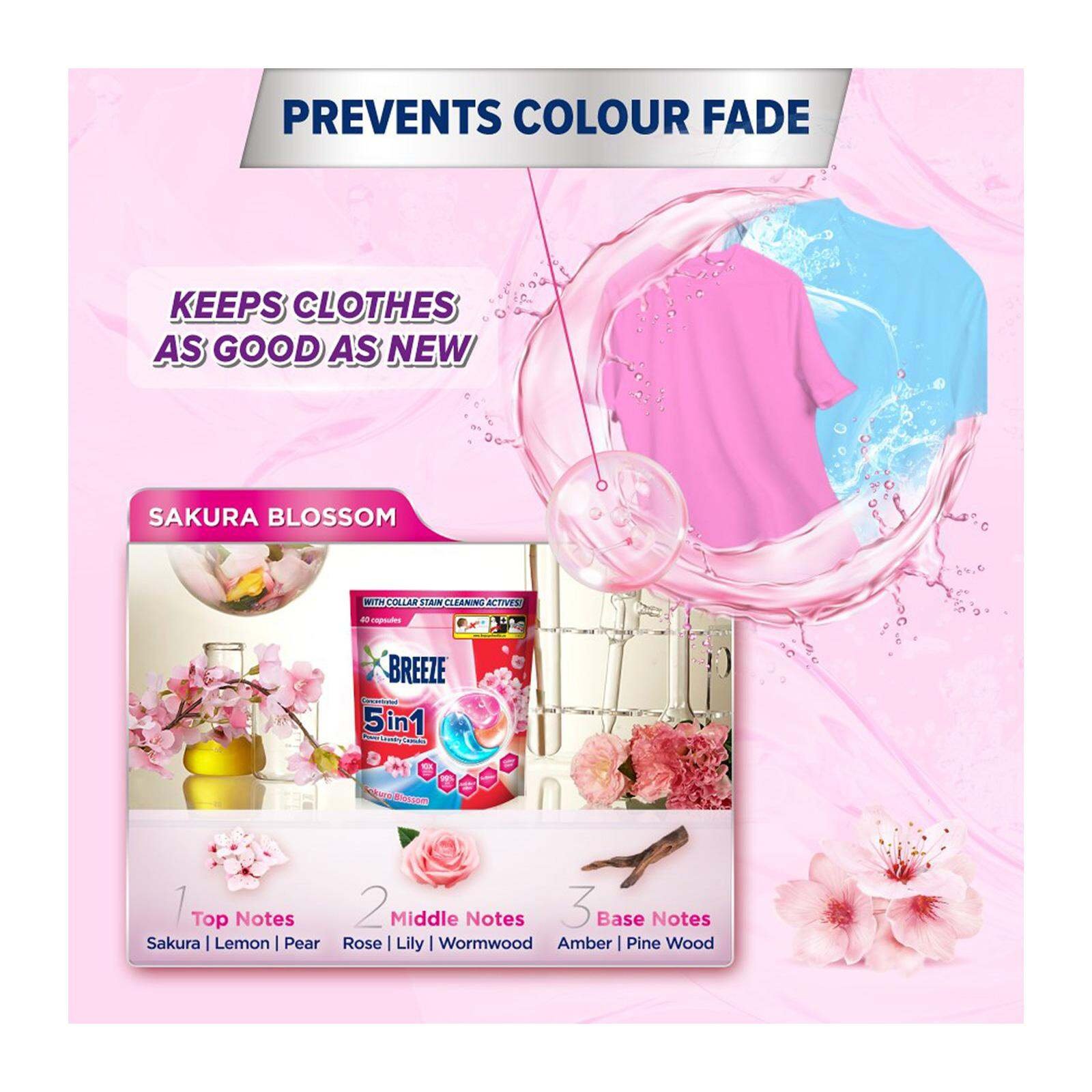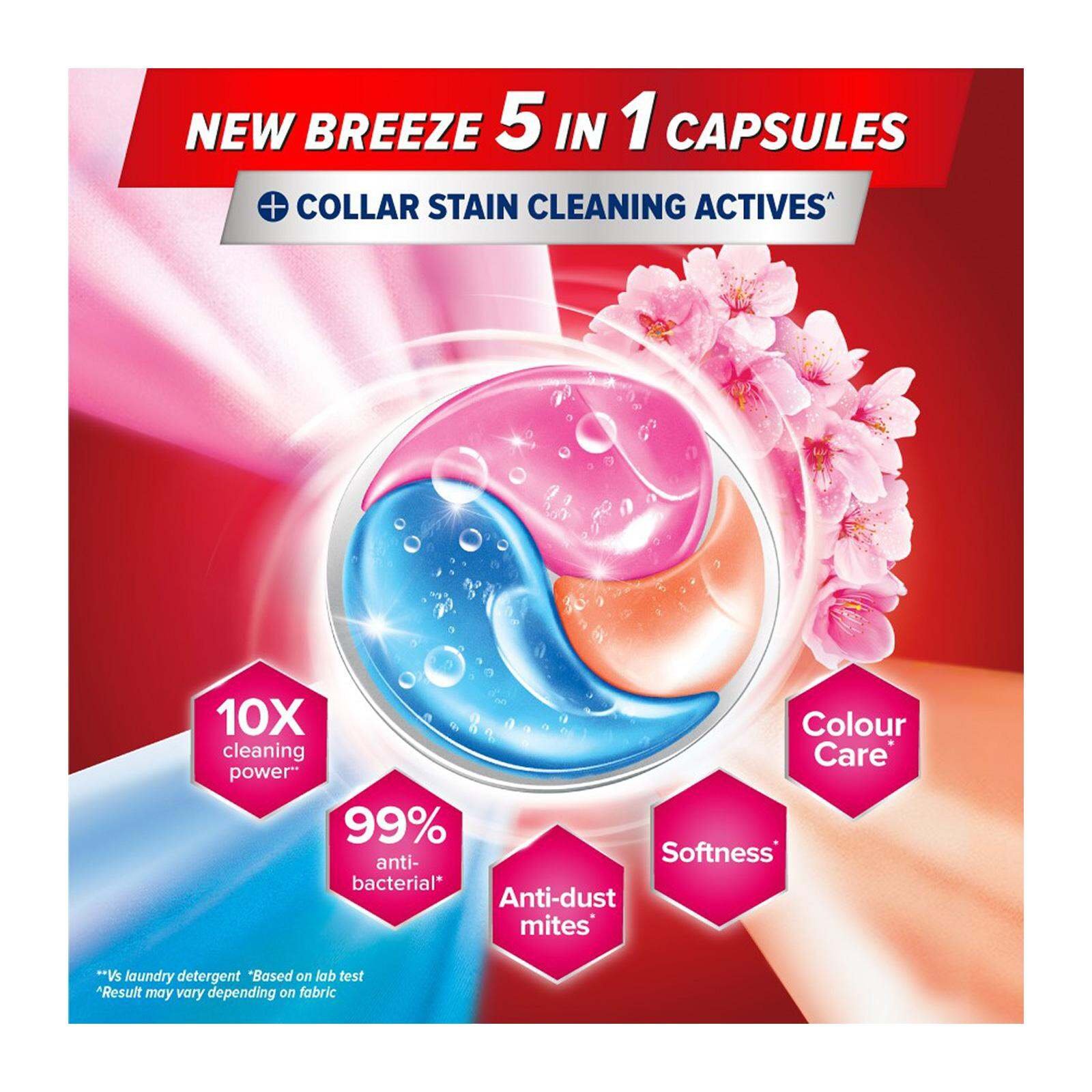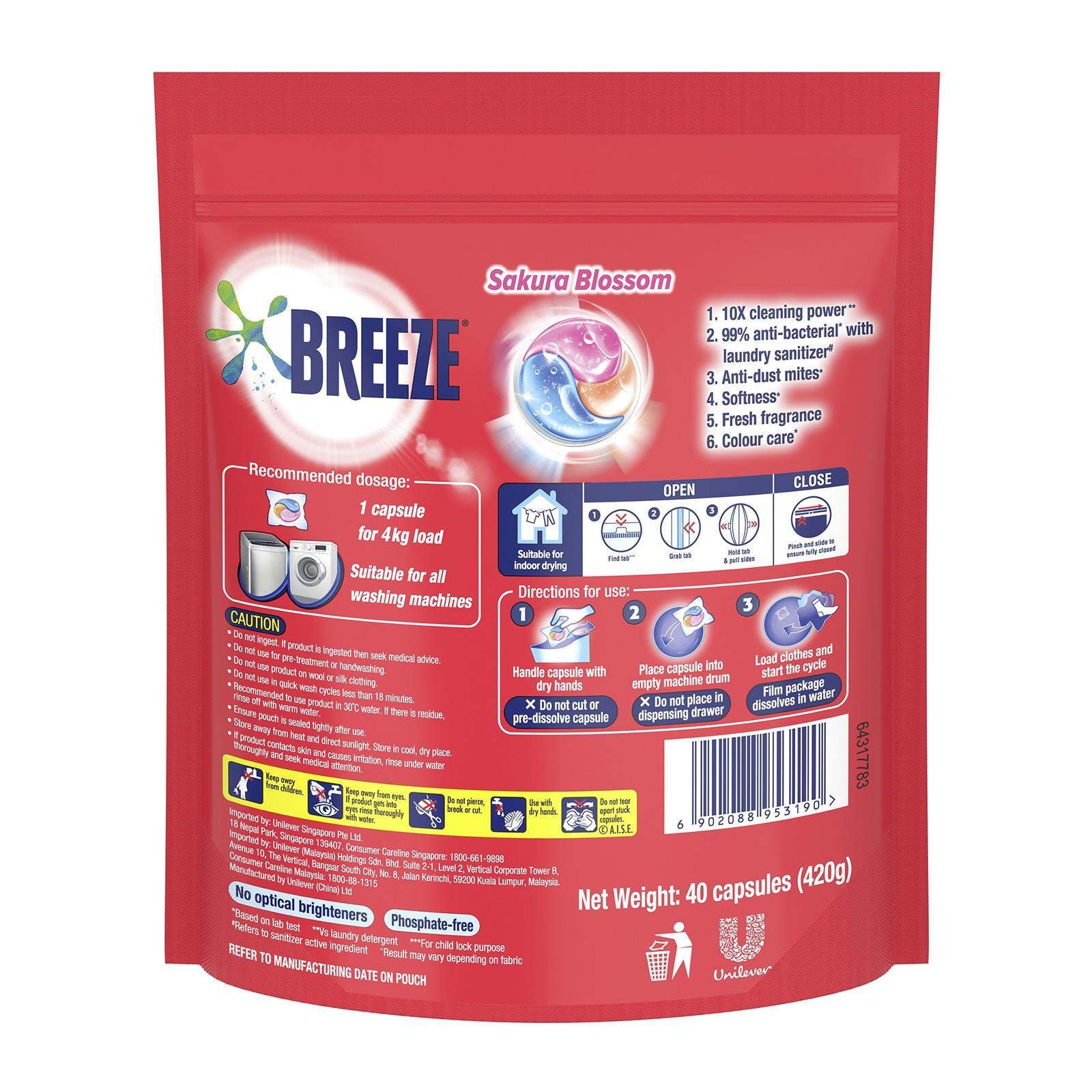 Breeze 3-in-1 Power Laundry Capsules are formulated with naturally-derived enzymes that eliminate 99 stubborn stains and even 7-day dried stains. With newly added laundry sanitiser, Breeze 3-in-1 Power Laundry Capsules are now 99% anti-bacterial and prevents bacterial growth for 72 hours. Breeze Sakura Blossom 3-in-1 Power Laundry Capsules deliver: Softer clothes with long-lasting Sakura fresh fragrance. Colour protection on clothes. 99% anti-dust mites. No optical brighteners. Suitable for indoor drying. 1 capsule for 5-7kg load, up to 15 pieces of clothing.